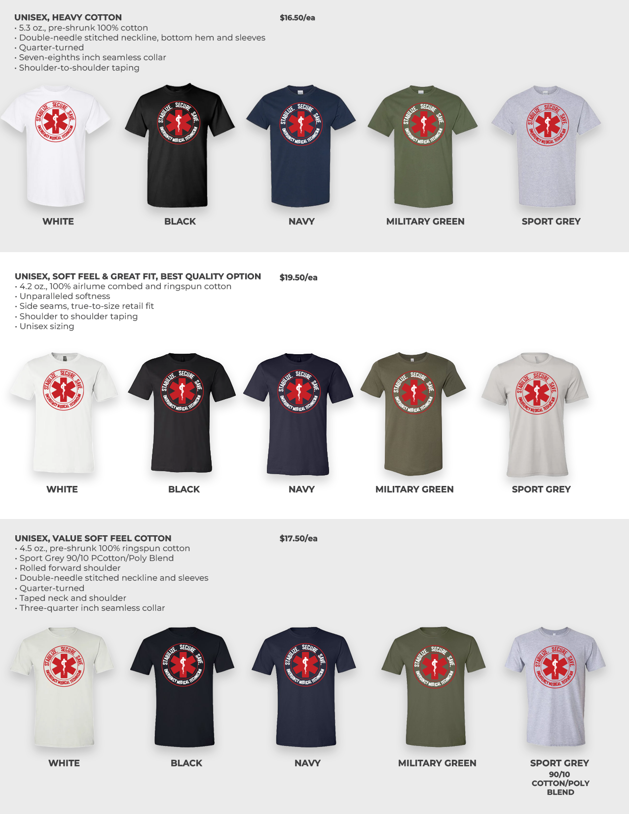 Here you will find three T-shirt options broken down by quality and price. Each price group includes mockups of the Star of Life design, slightly modified to accommodate the various fabric colors. Additionally, I’ve selected five of the most popular colors or those that work best with the design itself. There are many other color options available for each option, should you decide on different ones.